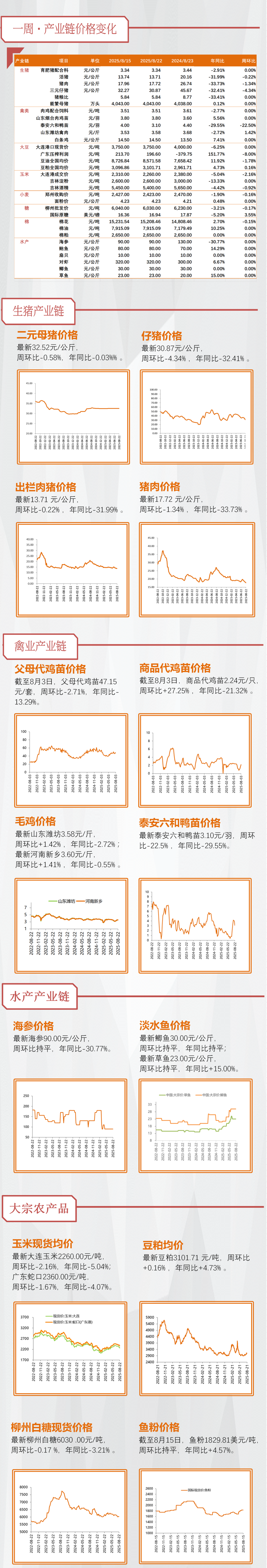 ②本周鸡苗价格稳定、毛鸡价格小幅震荡。截至8月23日,山东大厂商品代苗报价3.9元/羽(取区间中值),较上周末持平;山东区域主流毛鸡均价3.55元/斤,较上周末-0.05元/斤(数据来源:家禽信息PIB)。苗供应减少,计划偏紧。养殖端虽抵触高价,规模场补栏仍支撑苗价。毛鸡交投清淡,产品跌价,贸易谨慎;屠企高库亏损,宰杀意愿低。