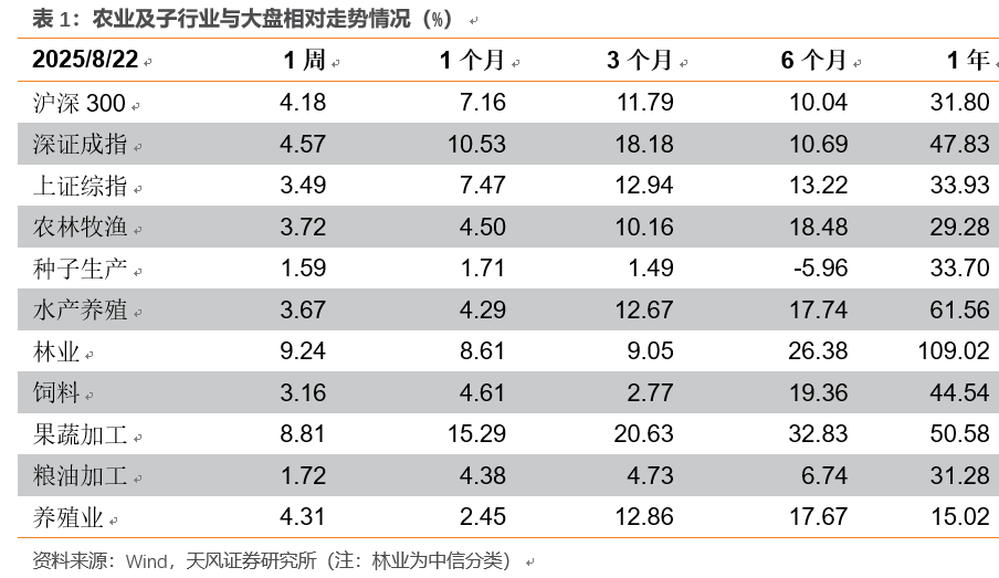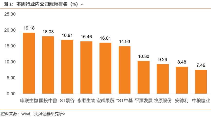 最新交易周(2025年8月18日-2025年8月22日),农林牧渔行业+3.72%,同期上证综指、深证成指、沪深300 变动分别为3.49%、4.57%、4.18%。个股中涨幅靠前的分别为:申联生物+19.18%、国投中鲁+18.03%、ST景谷+16.91%、永顺生物+16.46%、宏辉果蔬+16.01%、*ST中基+14.93%、平潭发展+10.30%、牧原股份+9.29%、安德利+8.48%、中粮糖业+7.49%。